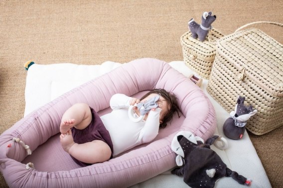 Niemowlęce gniazdko kokon z muślinu bawełnianego. Zapewnia maluchom przytulne warunki do snu i zabawy w domu i poza nim.