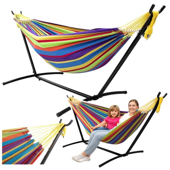 Kompletny zestaw hamakowy składający się z solidnego stalowego stelaża oraz dużego, wygodnego kolorowego hamaka. To doskonały wybór dla wszystkich, którzy cenią sobie komfortowy wypoczynek w ogrodzie, na tarasie lub balkonie.