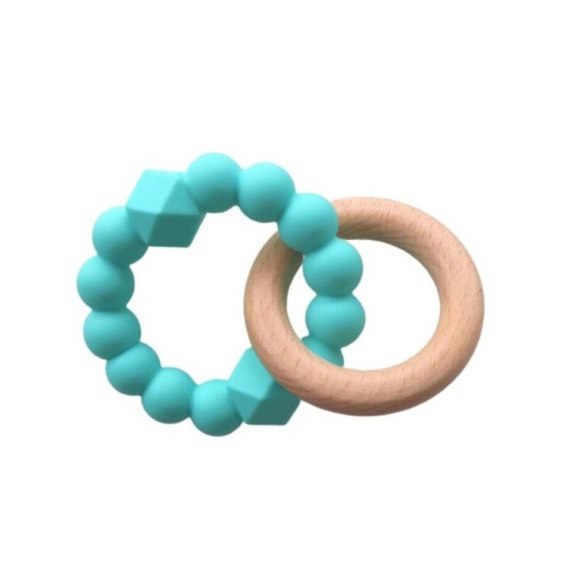 Gryzak dla dziecka wykonany z dwóch elementów. Gładkie kółko z drewna bukowego połączone z silikonowym gryzakiem sensorycznym o ciekawym kształcie.