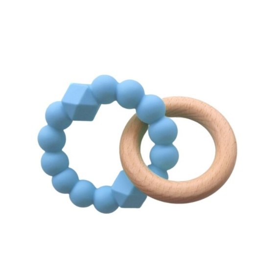 Gryzak dla dziecka wykonany z dwóch elementów. Gładkie kółko z drewna bukowego połączone z silikonowym gryzakiem sensorycznym o ciekawym kształcie.