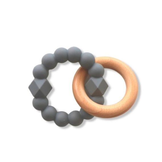 Gryzak dla dziecka wykonany z dwóch elementów. Gładkie kółko z drewna bukowego połączone z silikonowym gryzakiem sensorycznym o ciekawym kształcie.
