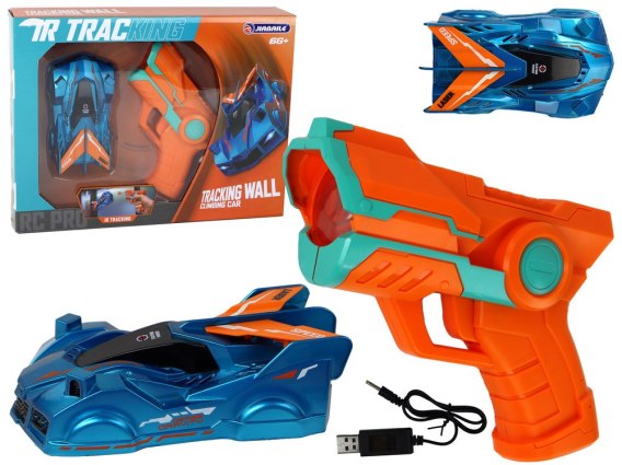 Niebieski samochodzik, który potrafi jeździć po ścianach i suficie, dzięki technologii niwelującej grawitację. Sterowanie odbywa się za pomocą dołączonego lasera.