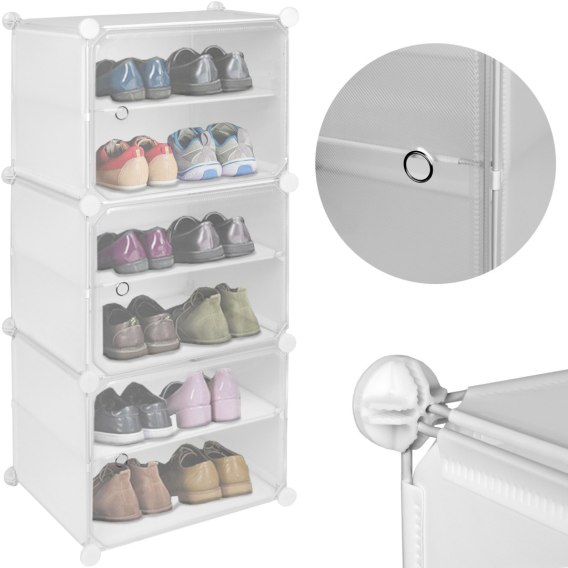 Szafka Pola pozwoli Ci zachować porządek z Twoim obuwiem. Chroni zawartość komór przed kurzem, jest wodoodporna i łatwa w utrzymaniu w czystości. Niewielkie rozmiary i modułowa konstrukcja sprawia, że model doskonale nada się jako uzupełnienie garderoby. Każda komora posiada dwie półki, w których bez problemu zmieścisz obuwie czy garderobiane dodatki. Jeśli chcesz mieć większą komorę, po prostu nie montuj półki. Wszystko zależy od Twojej wyobraźni. Przezroczyste okienka ułatwiają identyfikację obuwia w poszczególnych komorach. Każda z półek wykonana jest z metalowego stelażu i wodoodpornego materiału z przykuwającym uwagę wzorem. Montaż szafki jest łatwy i zajmuje niewiele czasu. Wystarczy połączyć poszczególne półki łącznikami z tworzywa ABS. Modułowa konstrukcja szafki Pola pozwoli Ci puścić wodze fantazji i skonstruować szafkę na buty o różnych kształtach i wymiarach. Wystarczy połączyć kolejne moduły ze sobą, by stworzyć garderoby i szafki na obuwie o dużych rozmiarach.