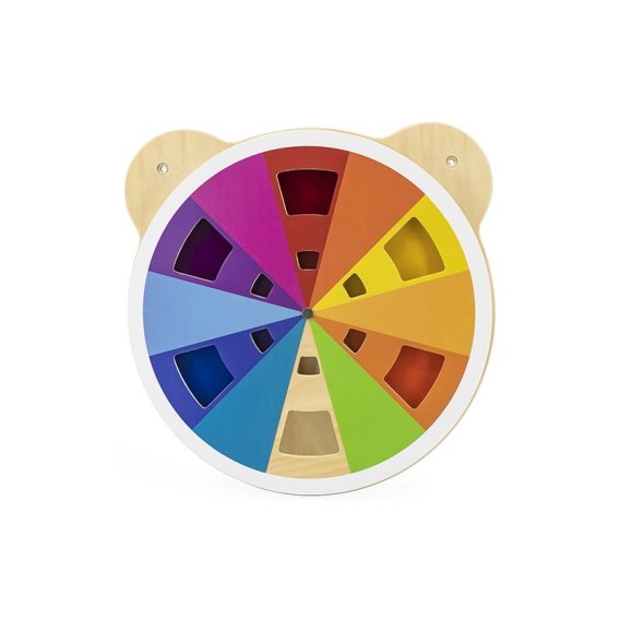 Jedna z serii drewnianych tablic z uroczą głową misia. Tablica z akrylową tarczą na przodzie w różnych odcieniach. Dziecko dzięki obracaniu tarczy tablicy może mieszać kolory w dowolny sposób i odkrywać jakie inne barwy powstają. W sumie można uzyskać 60 różnych kolorów. Produkt idealnie sprawdzi się zarówno w domowym zaciszu, jak i w placówkach oświatowych, wczesnoszkolnych. Ciekawe przygotowanie formy tablicy z pewnością przykuje uwagę każdego malucha. Całość wykonana została z drewna lakierowanego i pomalowana nietoksycznymi farbami w żywe barwy, które zadowolą każdego użytkownika i dadzą mnóstwo radości z zabawy. Produkt przeznaczony dla dzieci od 18 miesiąca życia. W naszej ofercie dostępna jest cała seria tablic z głową misia.