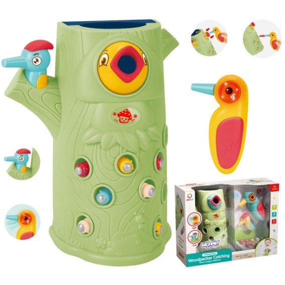Gra Zręcznościowa Złap Robaczka od marki WOOPIE to doskonały sposób na wspólne spędzanie czasu z dzieckiem. Proste zasady oraz intuicyjna obsługa sprawiają, że zagrać w nią może praktycznie każdy. Zabawa polega na chwytaniu dzięciołem zakończonym magnesem robaczków ukrytych w otworkach znajdujących się w drzewie, a następnie na ich ponownym wkładaniu w dziób ptaszka. W zestawie oprócz dwóch dzięciołów do karmienia pisklaka i kłody z pisklakiem, znajduję się aż 9 robaków. Większy dzięcioł posiada dodatkowe funkcje: świeci, rusza dziobem i wydaję dźwięk oraz melodię. Wystarczy nacisnąć na trzon i zapala się oko dzięcioła oraz wydobywa się skoczna przyjemna melodia, ptak może też ruszyć dziobem w dół., a jego oko zaświeci się przy dźwięku ćwierkania. Zestawem może się bawić jednocześnie dwoje dzieci. Gra uczy przez zabawę - pomoże rozwinąć m. in. umiejętności motoryczne (ruchowe) oraz wzrokowe. Zabawka jest sporym wyzwaniem dla malucha, wymaga skupienia uwagi oraz sprawności manualnej, ale przez to niezwykle zaciekawi dziecko.