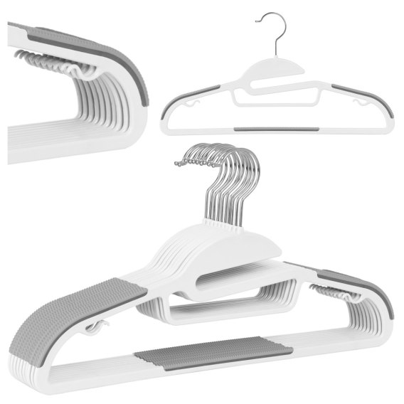Wieszaki Flexi 10 sztuk w kolorze biało-szarym - idealne do szafy, garderoby czy też ekspozycji odzieży. Wykonane są z mocnego i wytrzymałego tworzywa sztucznego. Szare, gumowe nakładki zapobiegają zsuwaniu się ubrań, a właściwe wyprofilowanie sprawia, że tkaniny nie ulegają deformacji. Wieszaki posiadają metalowy chromowany haczyk. Dodatkowe wcięcie ułatwia zakładanie odzieży, dzięki temu odzież się nie rozciąga i nie deformuje.