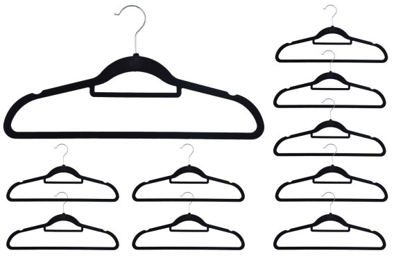 Komplet wieszaków aksamitnych. Flokowana powierzchnia czyni je bardzo praktycznymi, zapobiega bowiem zsuwaniu się ubrań. Wieszaki Maxi są odpowiednio profilowane, co pomaga uniknąć zagnieceń na odzieży.