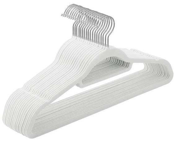 Wieszaki są wykonane z plastiku i w całości pokryte przyjemnym w dotyku welurem, dzięki czemu ubrania nie zsuwają się.