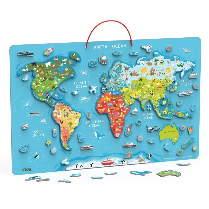 Tablica Edukacyjna 2w1 z Mapą Świata Viga łączy zabawę w rysowanie z odkrywaniem kontynentów i zwierząt. Dzięki magnetycznym elementom i opisom w języku angielskim dziecko nie tylko poznaje świat, ale też oswaja się z nowym językiem.