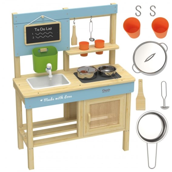 Naśladowanie dorosłych to dla dzieci fantastyczna zabawa! Drewniana kuchnia błotna marki Classic World to idealna zabawka dla małych miłośników gotowania na świeżym powietrzu! Zaprojektowana z dbałością o szczegóły, wykonana z naturalnego certyfikowanego drewna, z uroczymi pastelowymi akcentami - stworzona, by rozwijać kreatywność, zdolności manualne i wyobraźnię dziecka poprzez zabawę w dorosłe życie. Zabawka może służyć smykowi do zabawy w restaurację lub sklep. Można ją wykorzystywać na mnóstwo różnych sposobów, a kreatywnej rozrywce nie ma końca! Zbiornik z kranikiem umożliwia obieg wody, dzięki czemu dziecko może bawić się w gotowanie, mycie naczyń lub mieszać błotko.