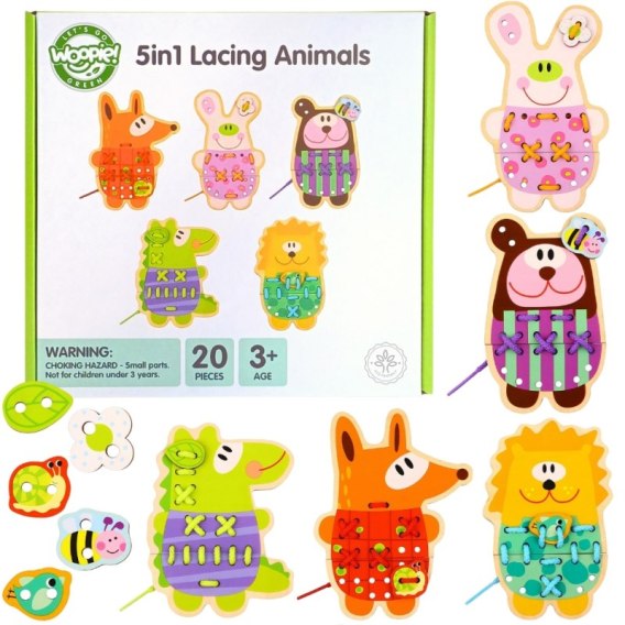 WOOPIE GREEN Drewniana Sznurowanka 5w1 Zwierzątka do Nawlekania