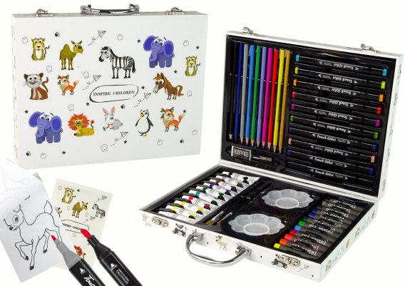 Ten zestaw artystyczny w białej, solidnej walizce z przyjaznymi zwierzątkami to idealny prezent dla małych artystów, którzy chcą odkrywać świat sztuki i zabawy. Ten zestaw małego artysty zawiera 68 elementów takich jak kredki, pisaki, farbki i pędzle. Ten zestaw artystyczny rozwija kreatywność i wyobraźnię u dzieci, wspiera rozwijanie umiejętności malarskich i rysunkowych, a także zachęca do eksperymentowania z kolorami i technikami. Daj swojemu dziecku szansę na wyrażenie siebie poprzez sztukę już dziś!
